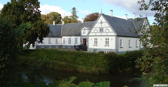Hovedbygningen ligger på et voldsted omgivet af vand til